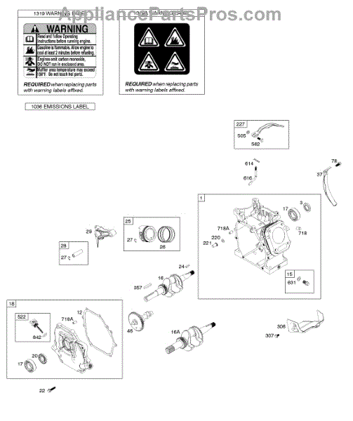 Parts for Briggs & Stratton 083152-0141-B1: Camshaft, Crankcase Cover, Crankshaft, Cylinder, Operator's Manual, Piston / Rings / Connecting Rod, Warning Label Parts