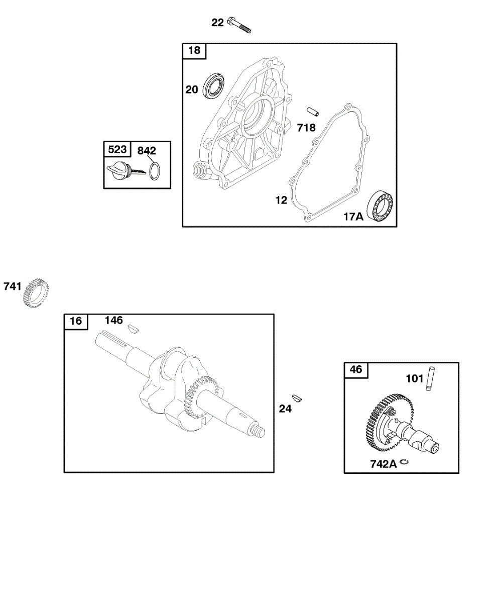 Parts for Briggs & Stratton 118436-0115-E1: Camshaft, Crankcase Cover, Crankshaft Parts