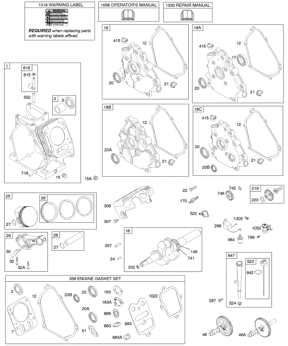 Parts for Briggs & Stratton 121312-0145-E2: Camshaft, Crankcase Cover, Crankshaft, Cylinder, Lubrication, Piston Group Parts