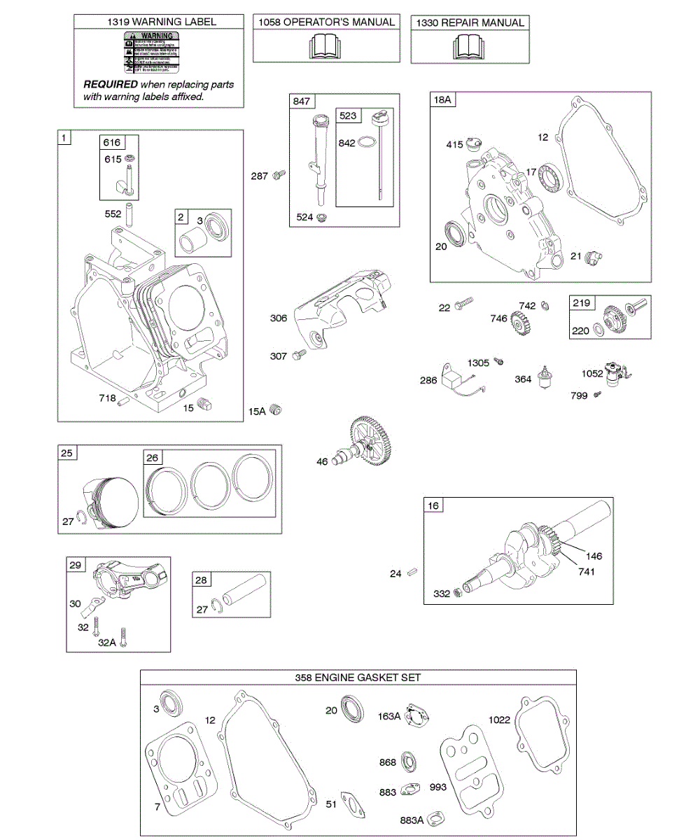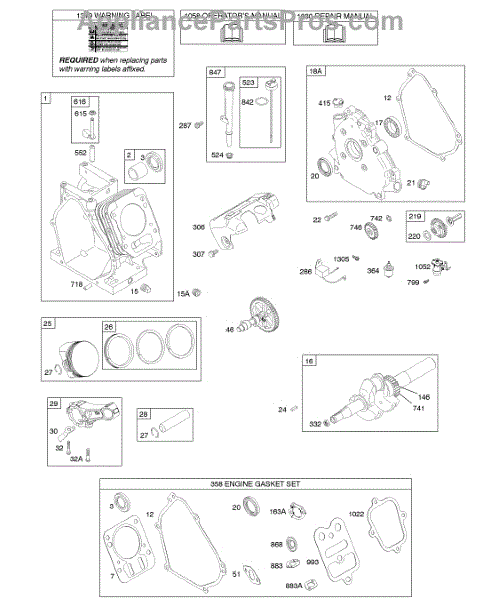 Parts for Briggs & Stratton 124032-0267-E1: Camshaft, Crankcase Cover, Crankshaft, Cylinder, Lubrication, Piston Group Parts