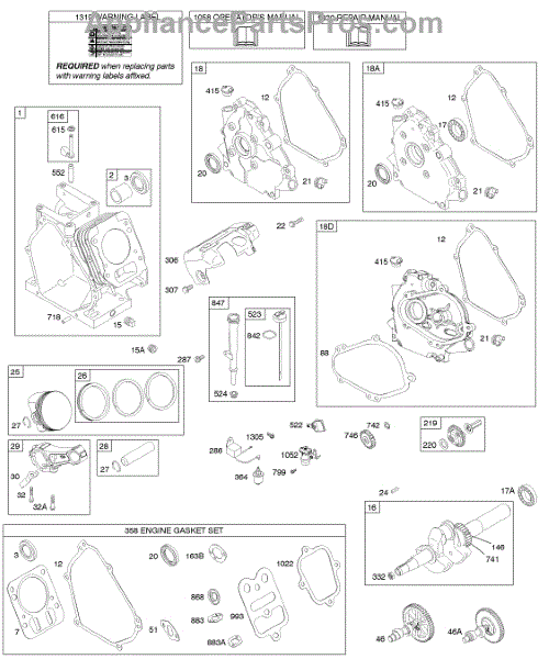 Parts for Briggs & Stratton 124332-0152-E1: Camshaft, Crankcase Cover, Crankshaft, Cylinder, Lubrication, Piston Group Parts