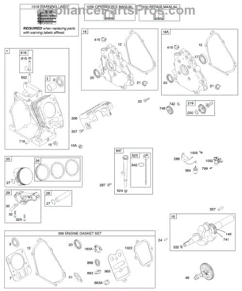 Parts for Briggs & Stratton 128332-0136-E1: Camshaft, Crankcase Cover, Crankshaft, Cylinder, Lubrication, Piston Group Parts