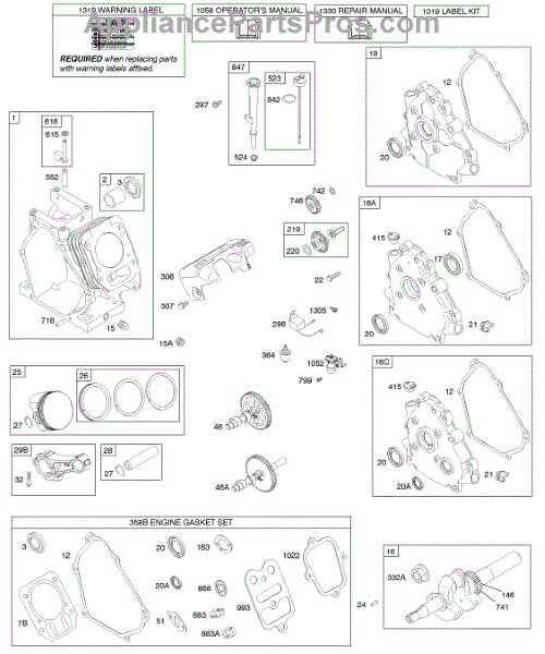 Parts for Briggs & Stratton 150112-0060-E1: Camshaft, Crankcase Cover, Crankshaft, Cylinder, Lubrication, Piston Group Parts