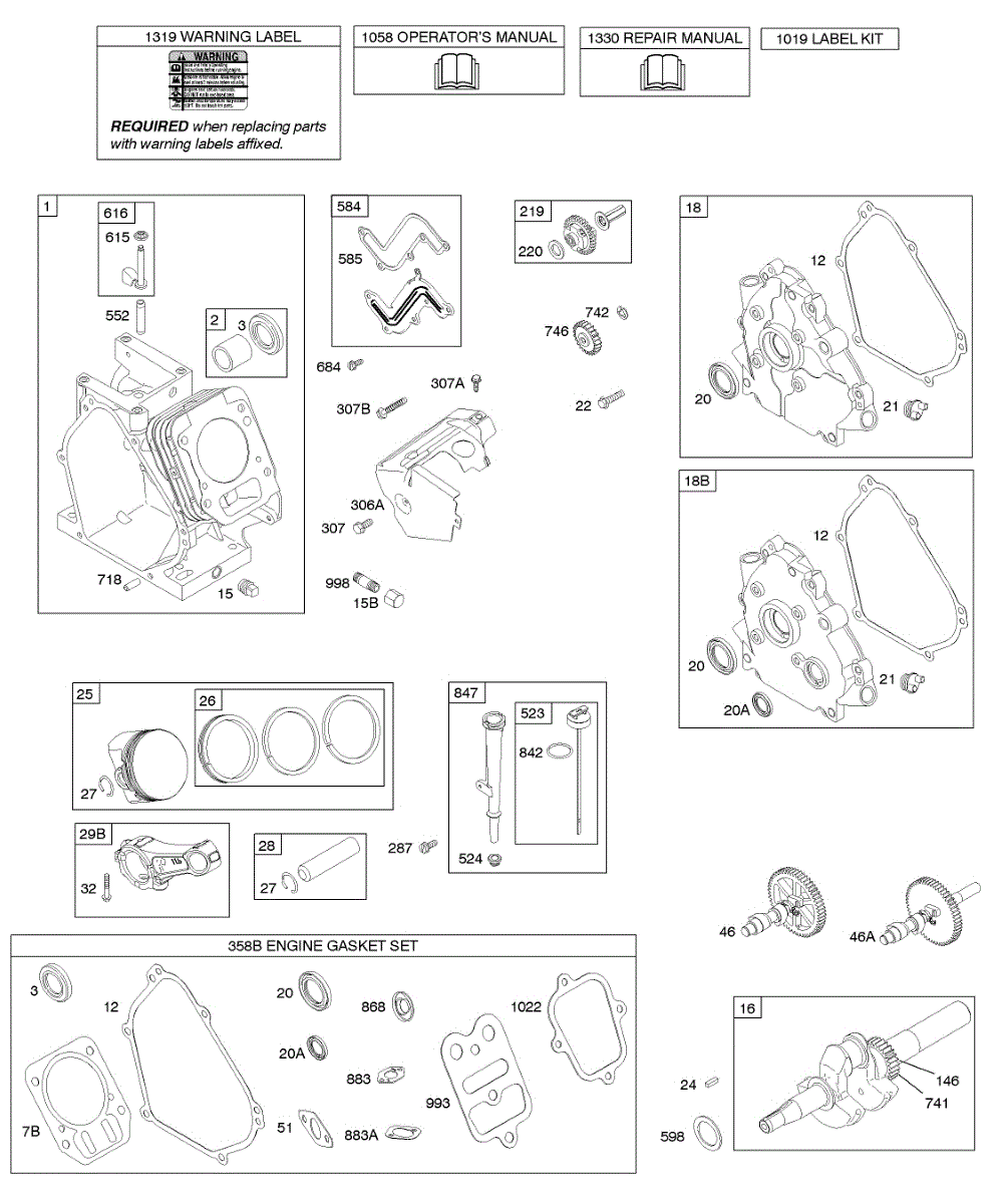 Parts for Briggs & Stratton 15B194-0018-E1: Camshaft, Crankcase Cover, Crankshaft, Cylinder, Lubrication, Piston Group Parts