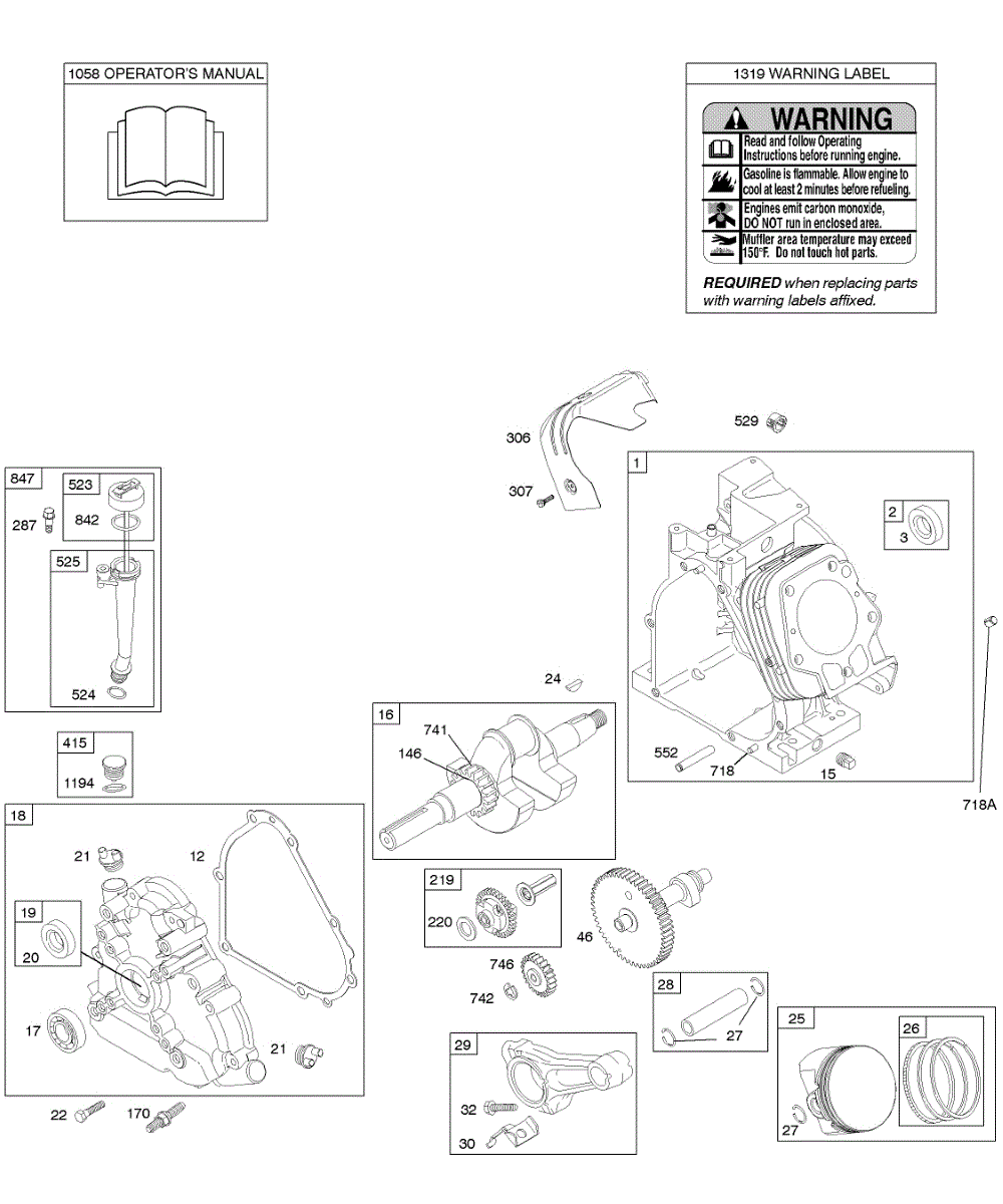 Parts for Briggs & Stratton 202436-0135-E1: Camshaft, Crankcase Cover, Crankshaft, Cylinder, Lubrication, Operator's Manual, Piston / Rings / Connecting Rod, Warning Label Parts