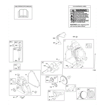 Parts for Briggs & Stratton 202437-0139-E9: Camshaft, Crankcase Cover, Crankshaft, Cylinder, Lubrication, Operator's Manual, Piston / Rings / Connecting Rod, Warning Label Parts