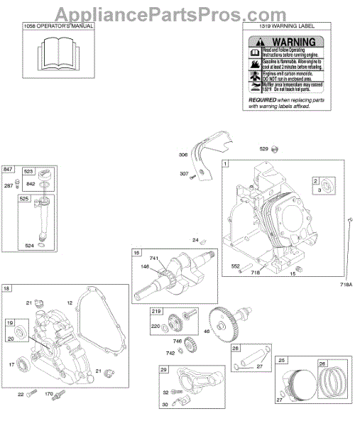 Parts for Briggs & Stratton 203432-0036-E9: Camshaft, Crankcase Cover, Crankshaft, Cylinder, Gasket Set - Engine, Lubrication, Operator's Manual, Piston / Rings / Connecting Rod, Warning Label Parts