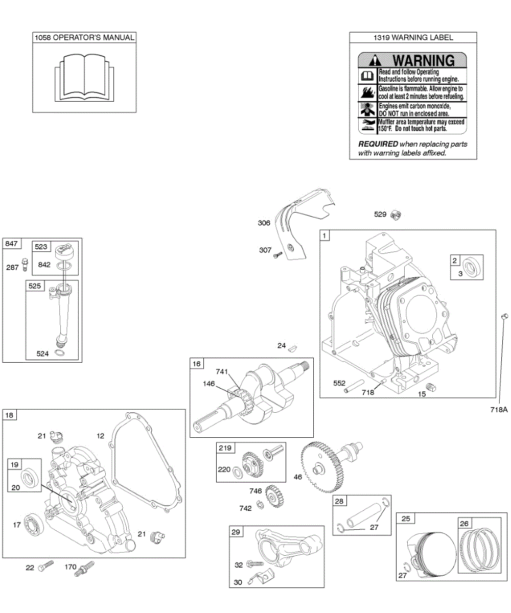 Parts for Briggs & Stratton 203432-0131-E9: Camshaft, Crankcase Cover, Crankshaft, Cylinder, Gasket Set - Engine, Lubrication, Operator's Manual, Piston / Rings / Connecting Rod, Warning Label Parts