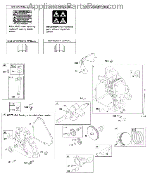 Parts for Briggs & Stratton 204317-0154-E1: Camshaft, Crankcase Cover, Crankshaft, Cylinder, Lubrication, Operator's Manual, Piston / Rings / Connecting Rod, Warning Label Parts