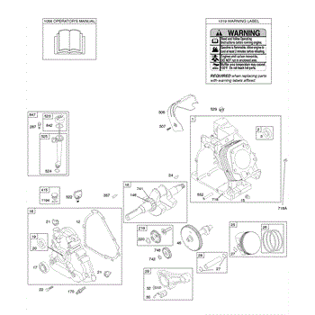Parts for Briggs & Stratton 206452-0124-E9: Camshaft, Crankcase Cover, Crankshaft, Cylinder, Lubrication, Operator's Manual, Piston / Rings / Connecting Rod, Warning Label Parts