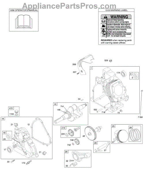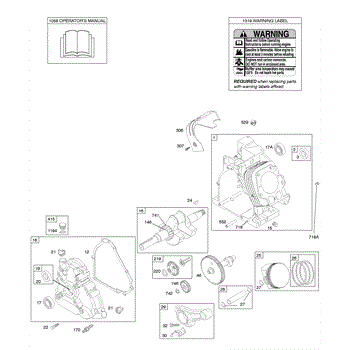 Parts for Briggs & Stratton 207437-0132-E9: Camshaft, Crankcase Cover, Crankshaft, Cylinder, Lubrication, Operator's Manual, Piston / Rings / Connecting Rod, Warning Label Parts