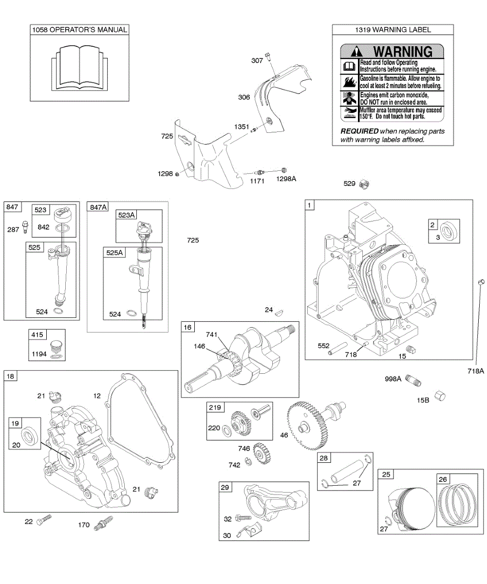 Parts for Briggs & Stratton 20A114-0650-E1: Camshaft, Crankcase Cover, Crankshaft, Cylinder, Lubrication, Operator's Manual, Piston / Rings / Connecting Rod, Warning Label Parts