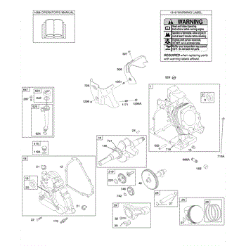 Parts for Briggs & Stratton 20A414-0110-E1: Camshaft, Crankcase Cover, Crankshaft, Cylinder, Lubrication, Operator's Manual, Piston / Rings / Connecting Rod, Warning Label Parts