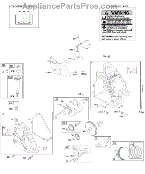 Parts for Briggs & Stratton 20C414-0206-E1: Camshaft, Crankcase Cover, Crankshaft, Cylinder, Lubrication, Operator's Manual, Piston / Rings / Connecting Rod, Warning Label Parts