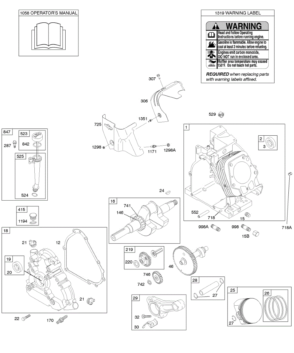 Parts for Briggs & Stratton 20C414-0372-E1: Camshaft, Crankcase Cover, Crankshaft, Cylinder, Lubrication, Operator's Manual, Piston / Rings / Connecting Rod, Warning Label Parts