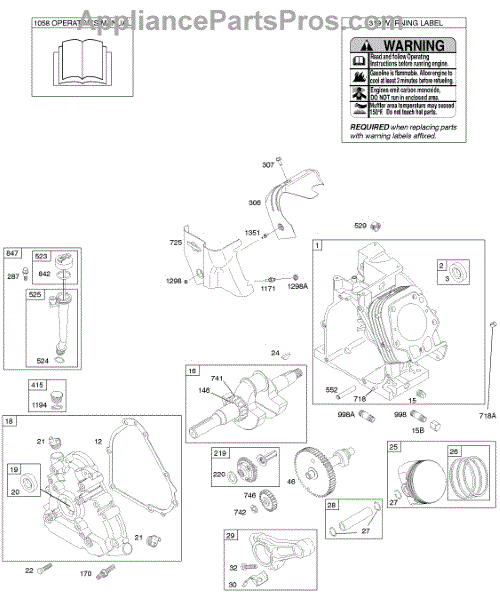 Parts for Briggs & Stratton 20D414-0017-E1: Camshaft, Crankcase Cover, Crankshaft, Cylinder, Lubrication, Operator's Manual, Piston / Rings / Connecting Rod, Warning Label Parts