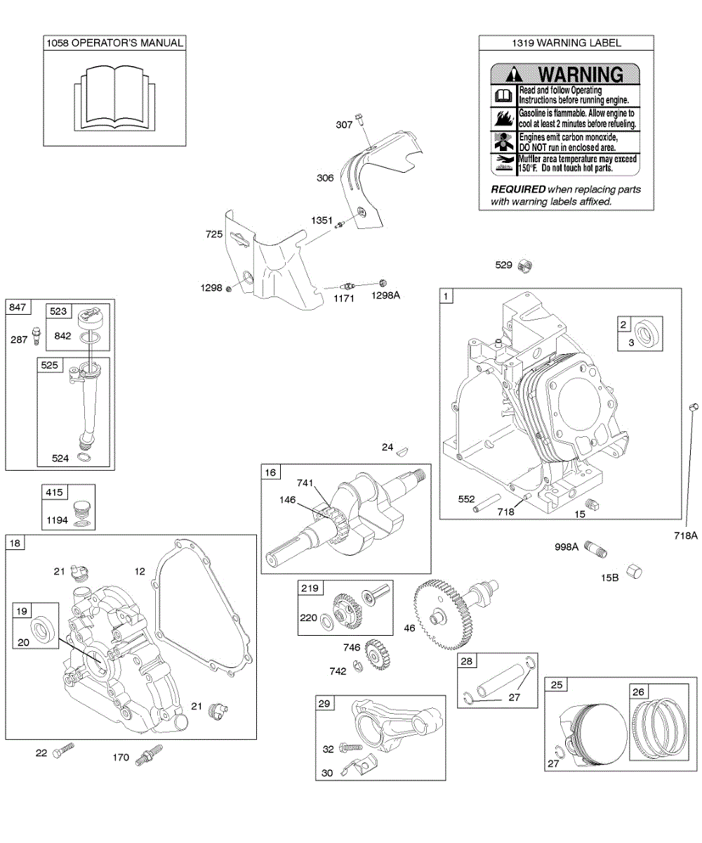 Parts for Briggs & Stratton 20E114-0114-E1: Camshaft, Crankcase Cover, Crankshaft, Cylinder, Lubrication, Operator's Manual, Piston / Rings / Connecting Rod, Warning Label Parts