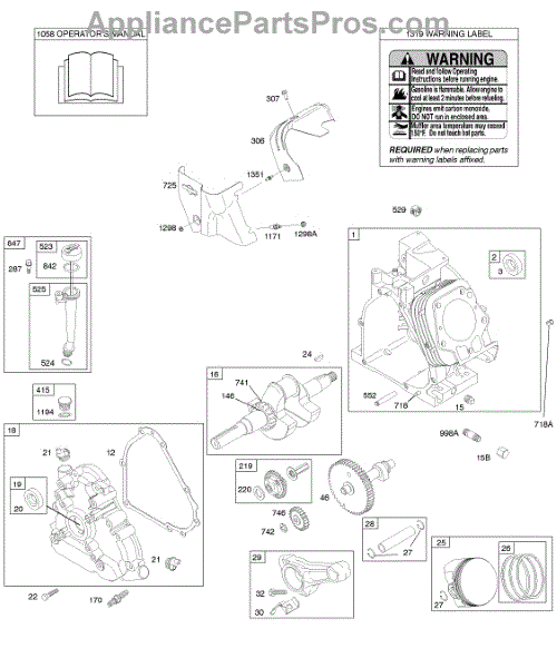 Parts for Briggs & Stratton 20E114-0644-E1: Camshaft, Crankcase Cover, Crankshaft, Cylinder, Lubrication, Operator's Manual, Piston / Rings / Connecting Rod, Warning Label Parts