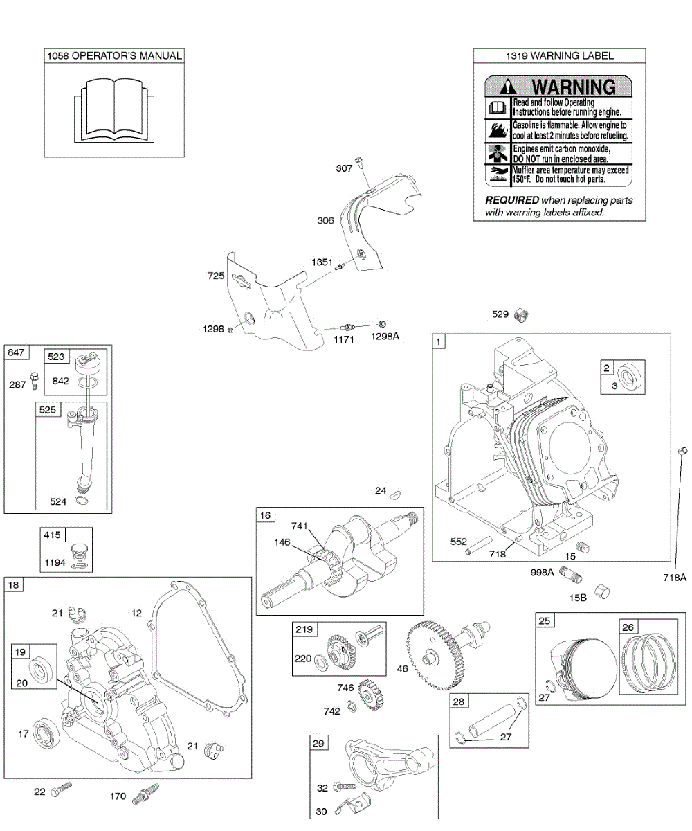 Parts for Briggs & Stratton 20F437-0114-E1: Camshaft, Crankcase Cover, Crankshaft, Cylinder, Lubrication, Operator's Manual, Piston / Rings / Connecting Rod, Warning Label Parts