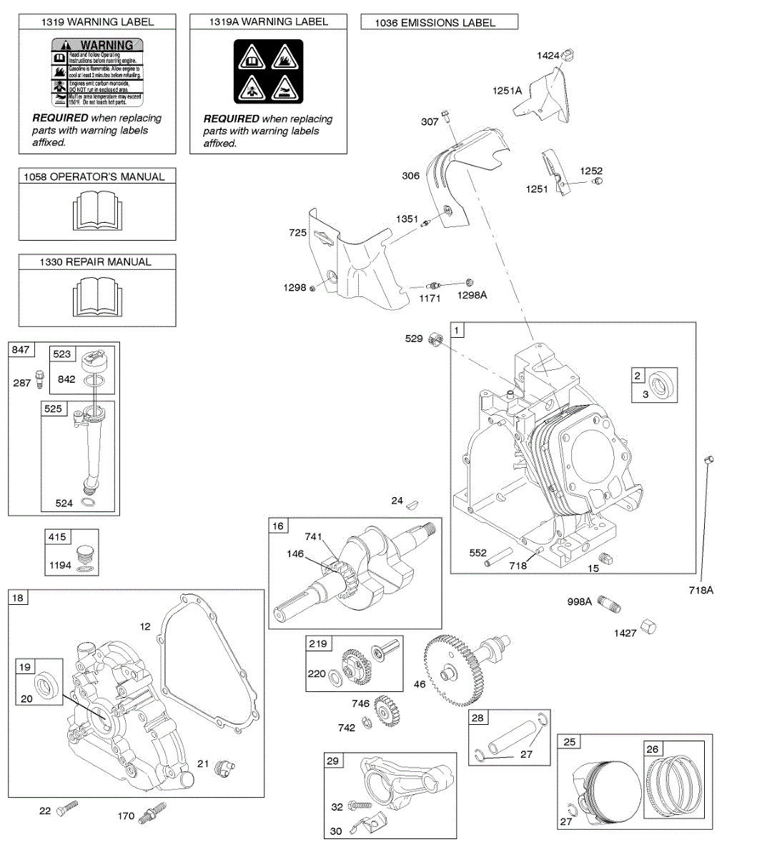Parts for Briggs & Stratton 20M114-0937-E1: Camshaft, Crankcase Cover, Crankshaft, Cylinder, Lubrication, Operator's Manual, Piston / Rings / Connecting Rod, Warning Label Parts