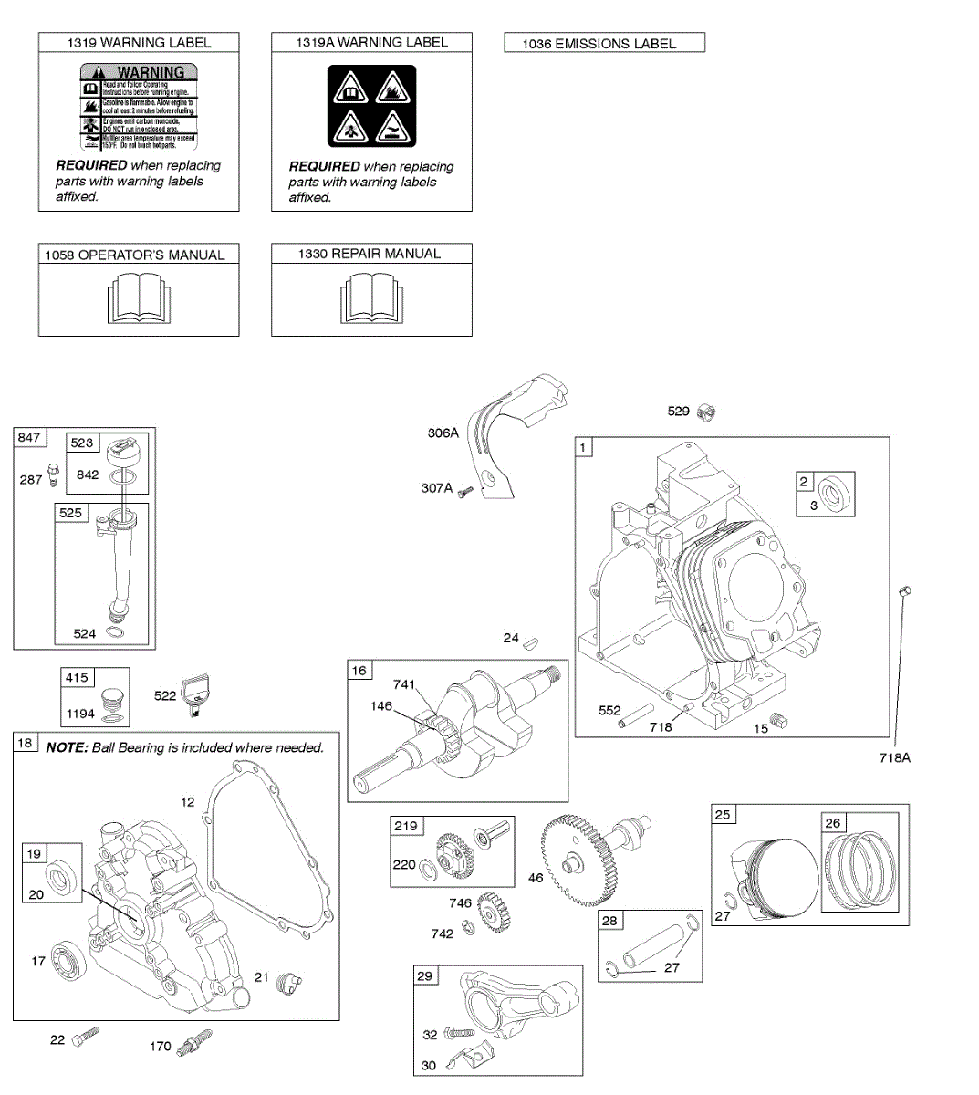Parts for Briggs & Stratton 210312-0150-B1: Camshaft, Crankcase Cover, Crankshaft, Cylinder, Lubrication, Operator's Manual, Piston / Rings / Connecting Rod, Warning Label Parts
