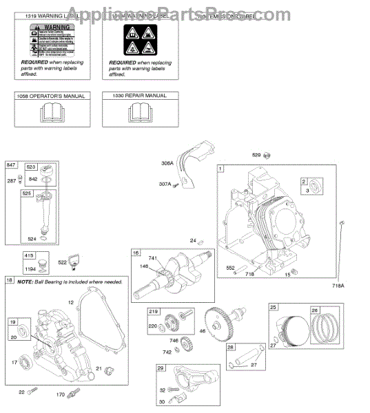 Parts for Briggs & Stratton 210317-0132-B1: Camshaft, Crankcase Cover, Crankshaft, Cylinder, Lubrication, Operator's Manual, Piston / Rings / Connecting Rod, Warning Label Parts