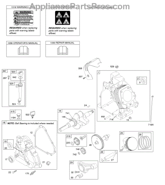 Parts for Briggs & Stratton 212312-0123-E1: Camshaft, Crankcase Cover, Crankshaft, Cylinder, Lubrication, Operator's Manual, Piston / Rings / Connecting Rod, Warning Label Parts
