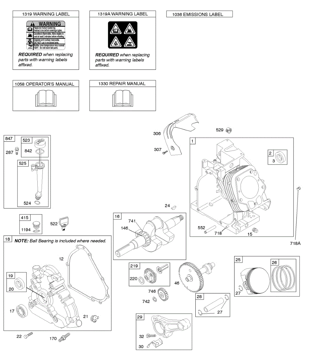 Parts for Briggs & Stratton 212337-1041-E9: Camshaft, Crankcase Cover, Crankshaft, Cylinder, Lubrication, Operator's Manual, Piston / Rings / Connecting Rod, Warning Label Parts