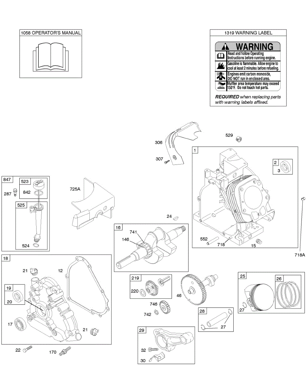 Parts for Briggs & Stratton 212415-0115-E1: Camshaft, Crankcase Cover, Crankshaft, Cylinder, Lubrication, Operator's Manual, Piston / Rings / Connecting Rod, Warning Label Parts