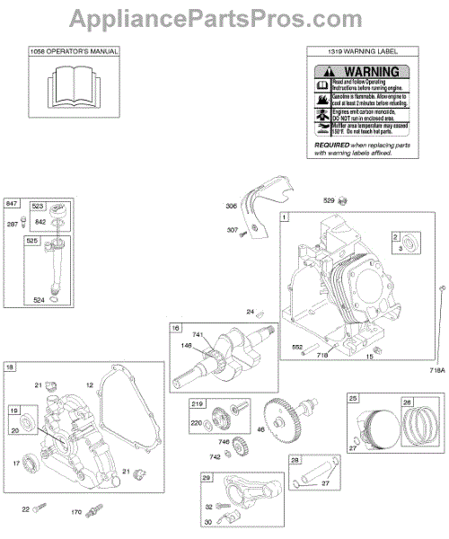 Parts for Briggs & Stratton 213432-0111-E1: Camshaft, Crankcase Cover, Crankshaft, Cylinder, Lubrication, Operator's Manual, Piston / Rings / Connecting Rod, Warning Label Parts