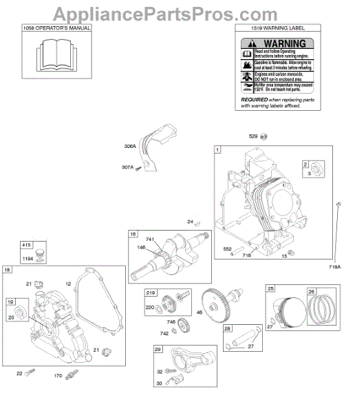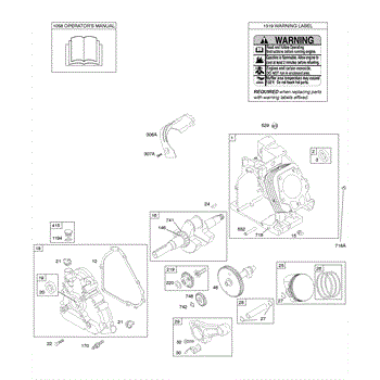 Parts for Briggs & Stratton 216112-0110-E1: Camshaft, Crankcase Cover, Crankshaft, Cylinder, Operator's Manual, Piston / Rings / Connecting Rod, Warning Label Parts