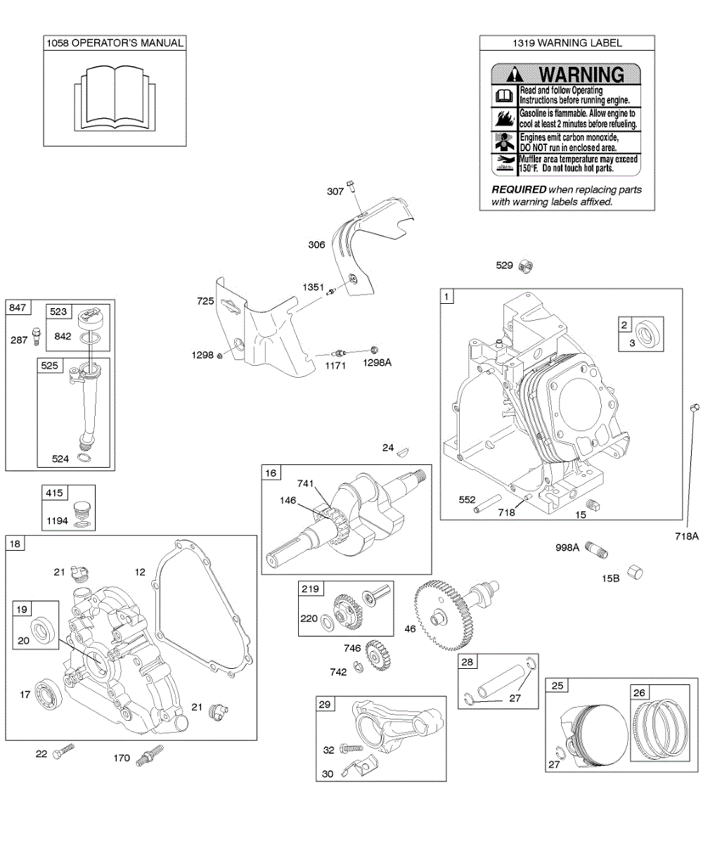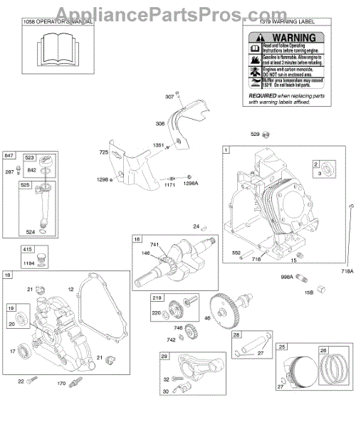 Parts for Briggs & Stratton 21A414-0133-E1: Camshaft, Crankcase Cover, Crankshaft, Cylinder, Lubrication, Operator's Manual, Piston / Rings / Connecting Rod, Warning Label Parts