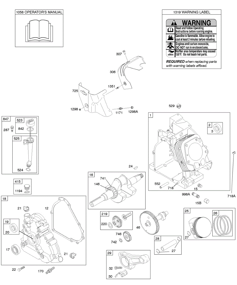 Parts for Briggs & Stratton 21C314-0116-E1: Camshaft, Crankcase Cover, Crankshaft, Cylinder, Lubrication, Operator's Manual, Piston / Rings / Connecting Rod, Warning Label Parts