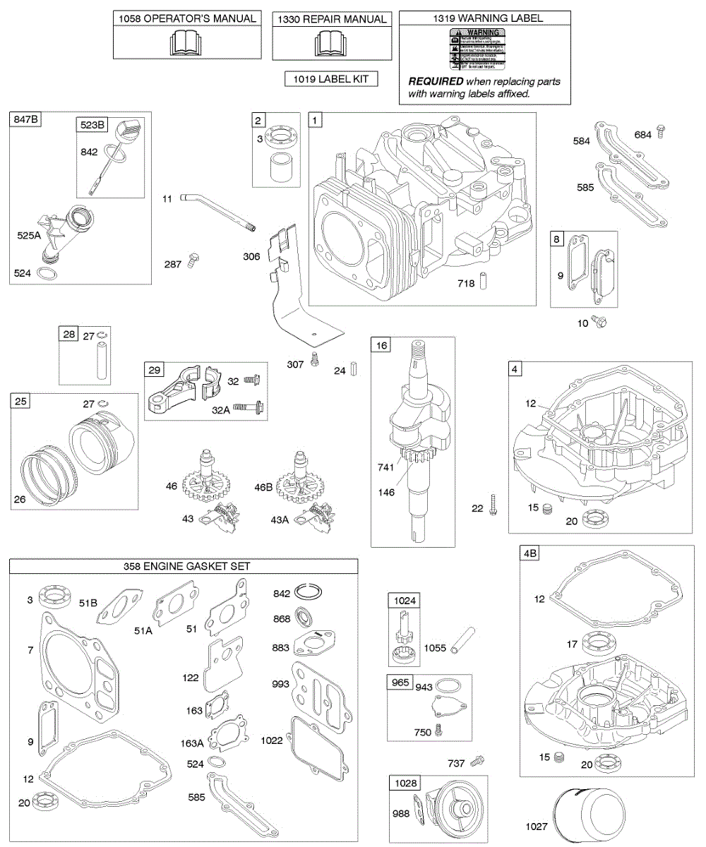 Parts for Briggs & Stratton 123602-0141-E1: Camshaft, Crankshaft, Cylinder, Engine Sump, Lubrication, Piston Group Parts