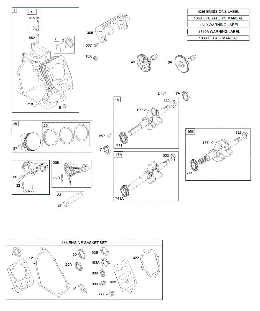 Parts for Briggs & Stratton 127332-0036-E2: Camshaft, Crankshaft, Cylinder, Piston Group Parts