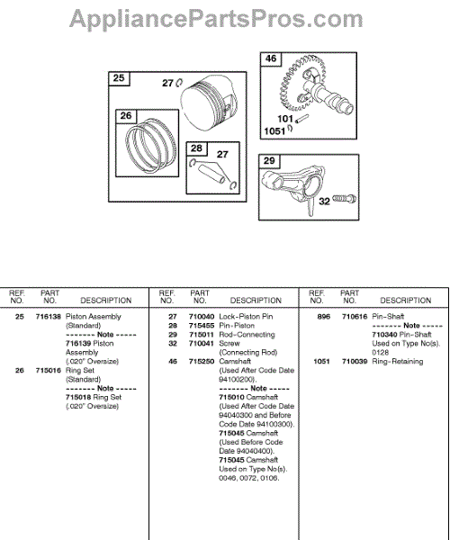 Parts for Briggs & Stratton 115432-0130-01: Camshaft, Piston, Rings, Connecting Rod Parts