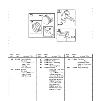 Parts for Briggs & Stratton 115432-0139-01: Camshaft, Piston, Rings, Connecting Rod Parts