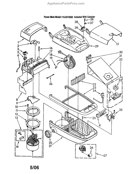 Parts for Kenmore 116.2354890 (1162354890, 116 2354890): Canopy / Motor / Cord Reel / Hood Parts