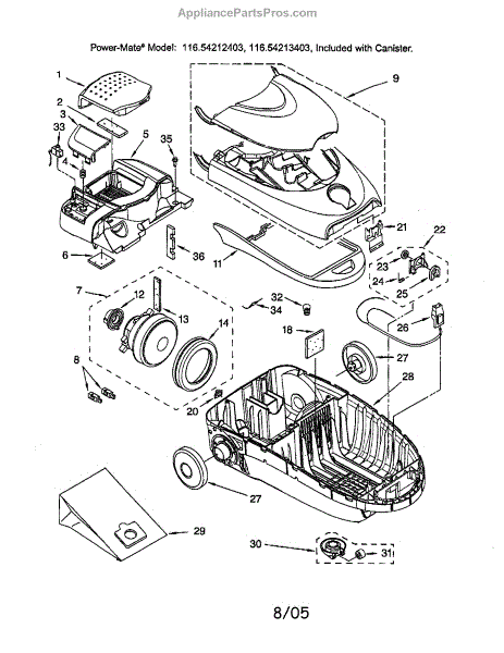 Parts for Kenmore 116.24213403 (11624213403, 116 24213403): Canopy / Motor, Fan / Base Parts