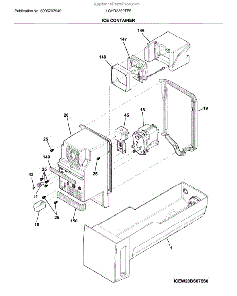This OEM replacement part is an ice container for refrigerators. The ice container is the plastic bucket that holds the ice that is made by the icemaker. Over time, an ice container can become damaged due to excessive wear and tear. If the ice container is cracked or broken to the point where it can no longer hold ice, it will need to be replaced.To replace the ice container, start by unplugging the refrigerator. Once unplugged, proceed to open the freezer door. Locate the two mounting screws that attach the ice container to the icemaker. Once found, proceed to unthread the screws to remove the old container. After pulling the old container out, slide the new one in place and fasten the mounting screws that secure it to the icemaker. This genuine replacement part is sourced directly from the manufacturer and is sold individually. It is compatible with Frigidaire, Electrolux, Gibson, Kelvinator, and Westinghouse brand refrigerators.