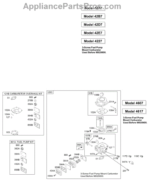 Parts for Briggs & Stratton 461707-0147-E1: Carburetor 2, Kit / Gasket Sets - Carburetor 2, Kit / Gasket Sets - Fuel Pump 2 Parts