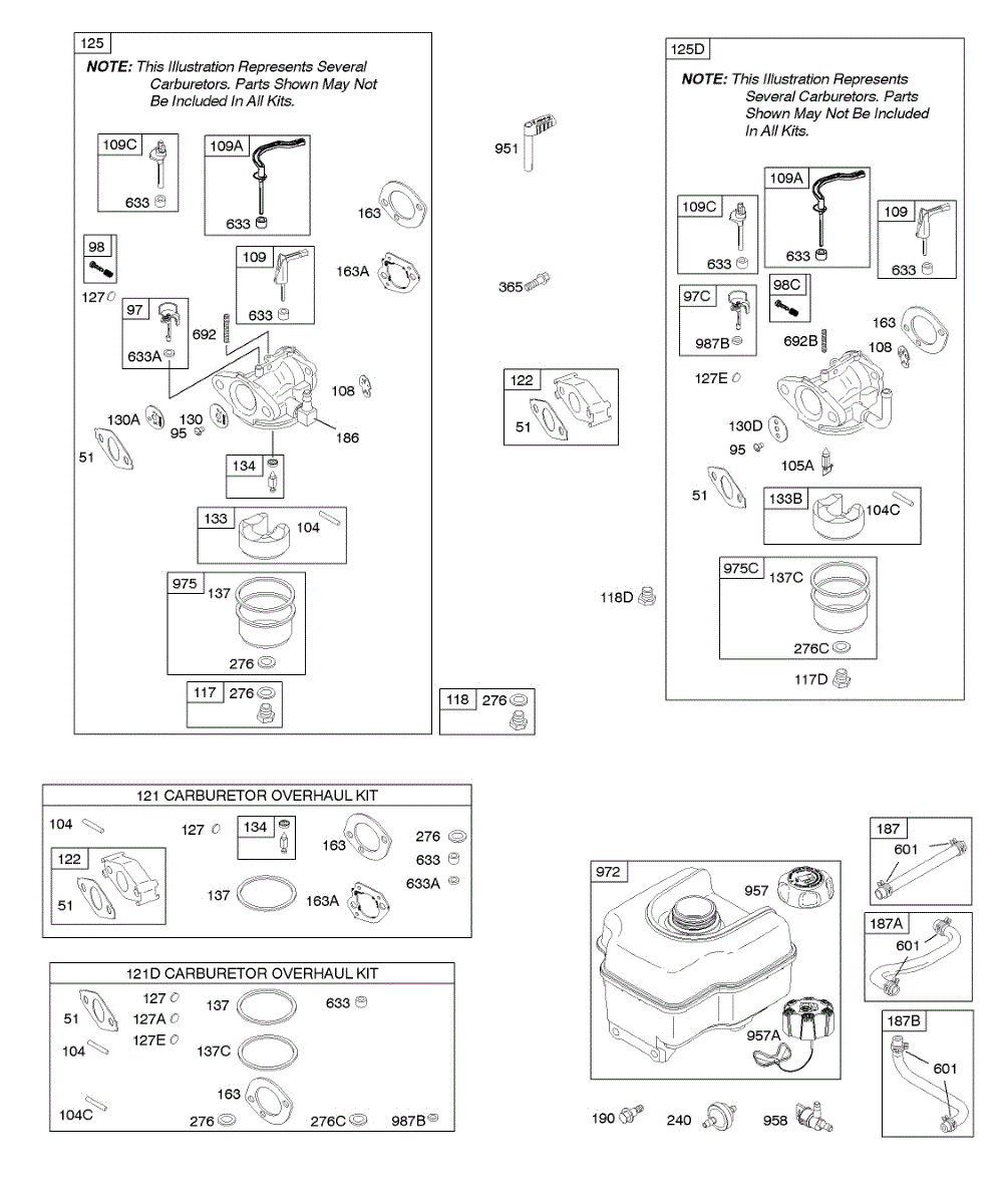 Complete carburetor overhaul kit for lawn and garden engines. Includes gaskets, seals, and components to rebuild a worn or damaged carburetor assembly.