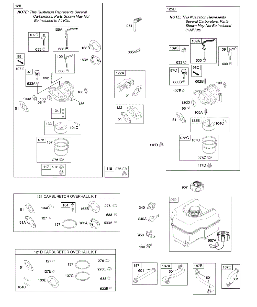 Complete carburetor overhaul kit for lawn and garden engines. Includes gaskets, seals, and components to rebuild a worn or damaged carburetor assembly.