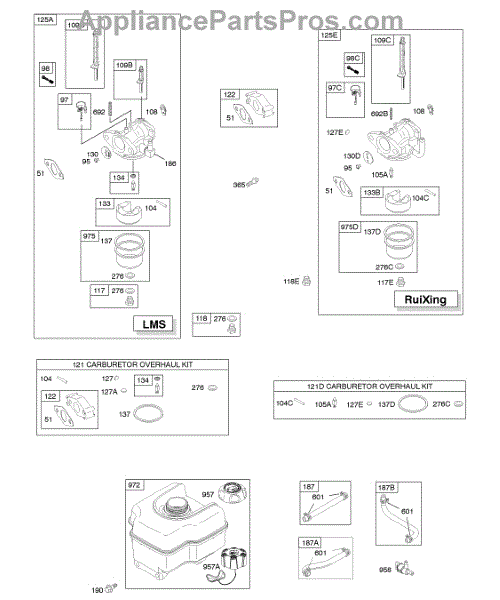 This replacement part is a carburetor overhaul kit. This kit includes multiple parts that are needed to rebuild or repair a damaged carburetor.Be sure to diagnose the issue before purchasing this kit to ensure that the needed parts are included. A damaged carburetor may cause hard starting or black smoke exhaust during use. Wear work gloves when working with the carburetor. The engine should be powered down and cooled off before starting this job.This is a genuine OEM replacement part manufactured by Midwest Engine. This part is sold individually.