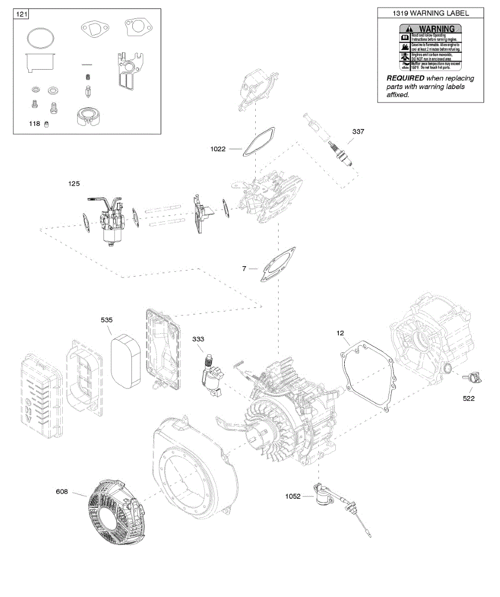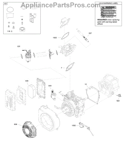 Parts for Briggs & Stratton 12G032-0001-G1: Carburetor, Gaskets, Ignition, Lubrication, Operator's Manual, Rewind Starter, Spark Plug, Warning Label Parts