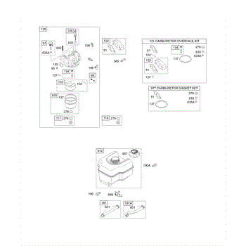 Parts for Briggs & Stratton 12D412-0110-E1: Carburetor Group, Fuel Tank Group, Kits / Gaskets - Carburetor Parts