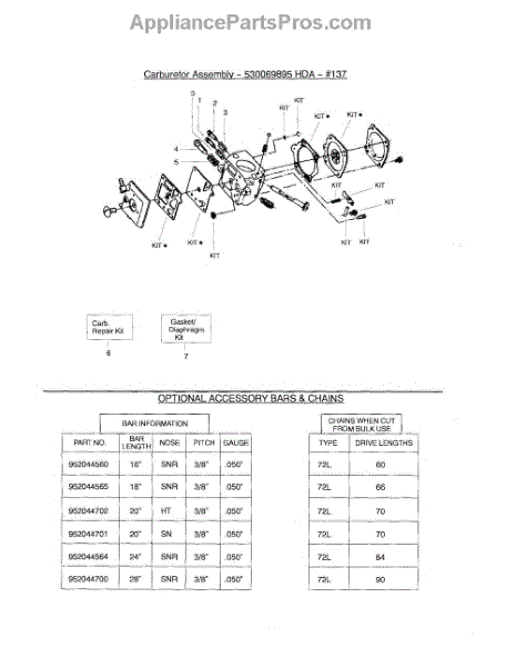This is a carburetor repair kit for lawn and garden equipment. It can be used in situations where the carburetor is clogged and no longer capable of putting the right amount of fuel through the engine. The carburetor is a part that is responsible for mixing fuel and air inside of a combustion engine. It then sends the mixture to the cylinder to power the engine. A yard and garden tool with a carburetor can experience a build-up of debris or stickier material over time that can clog up the carburetor and create issues with the engine. This can make the trimmer run sluggish or cause problems with other components. If the situation gets worse, the engine may not start at all. When this happens, a carburetor repair kit has the needed components to rebuild the carburetor.This carburetor repair kit is a genuine OEM component sourced directly from the manufacturer. It is sold as an individual kit. The repair kit is compatible with certain string trimmers and chainsaws manufactured by Craftsman, Poulan, and Poulan Pro. The replacement may require an Allen wrench, needle-nose pliers, and a Phillips screwdriver.