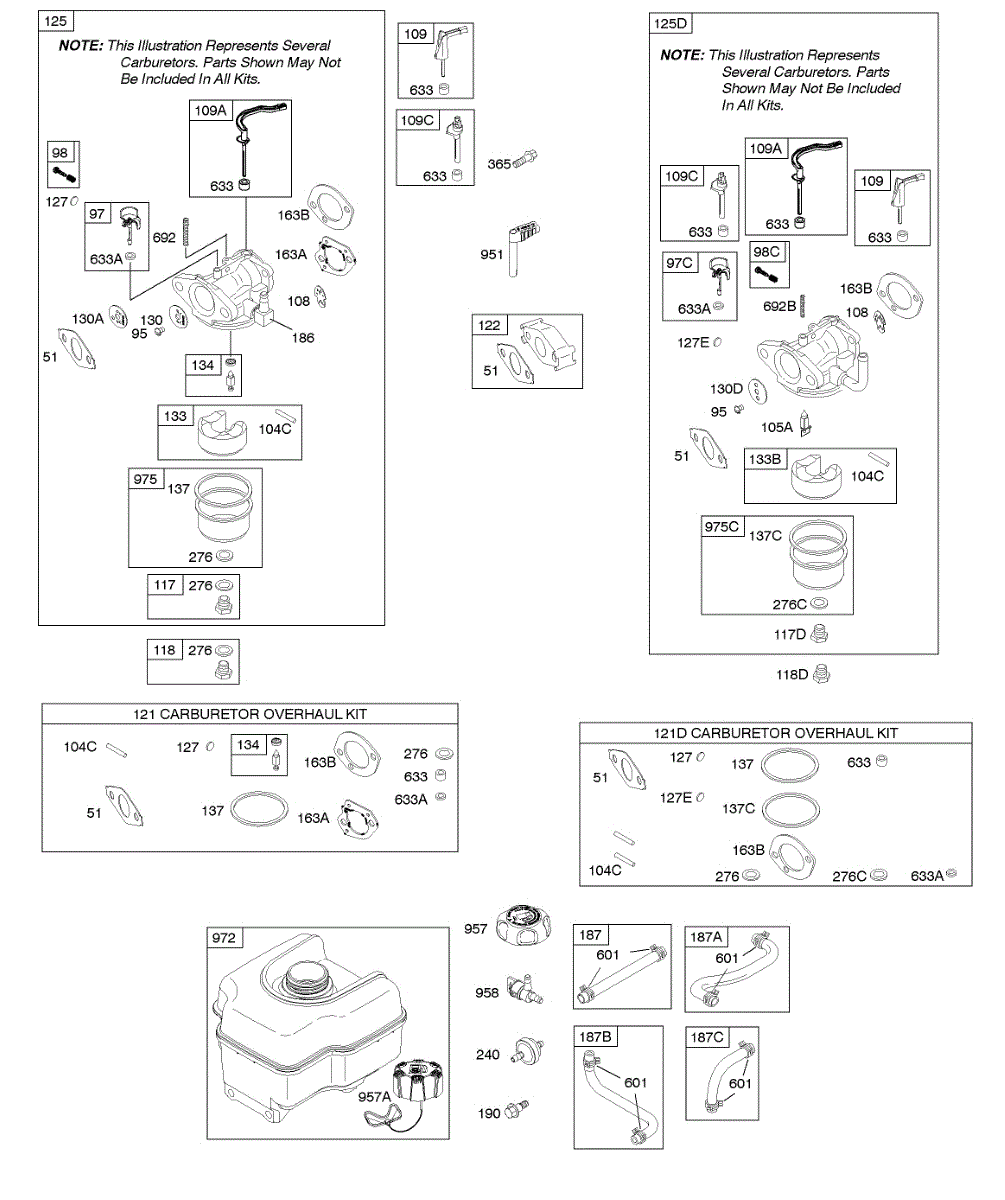 Complete carburetor overhaul kit for lawn and garden engines. Includes gaskets, seals, and components to rebuild a worn or damaged carburetor assembly.