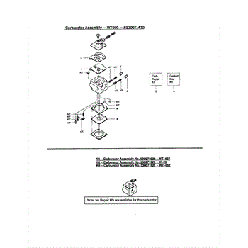 Carburetor gasket kit for chainsaws, trimmers, blowers, and edgers. Replace when experiencing fuel leaks or poor engine performance. Verify fit.