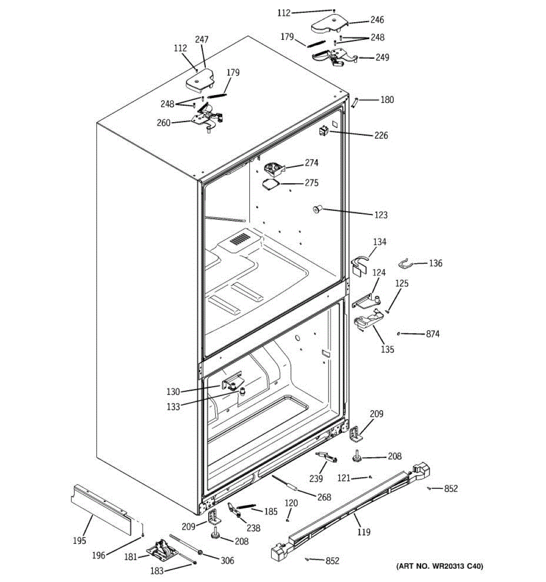Door hinge closure assembly for refrigerators. Secures door alignment and smooth operation. Replace if hinge is cracked, worn, or door sags.